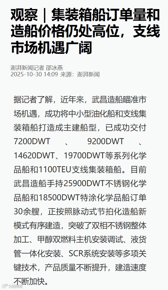 澎湃新闻《集装箱船订单量和制造价格仍处于高位,支线市场机遇广阔》(2025/10/30)