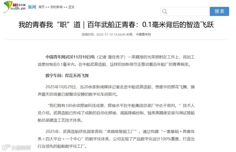 中国青年网《我的青春我“职”道|百年武船正青春:0.1毫米背后的智造飞跃》 (2025/11/10)