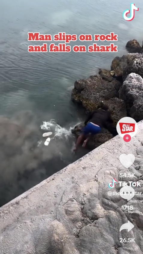 当男子想帮朋友把鱼线收回时,一个不小心竟然脚滑跌入海中,人还刚好摔到鲨鱼的尾部,鲨鱼立即转身想要攻击他的腿时,幸好他动作很快,赶紧弃鞋、赤脚爬回岩石上,才逃过一劫。