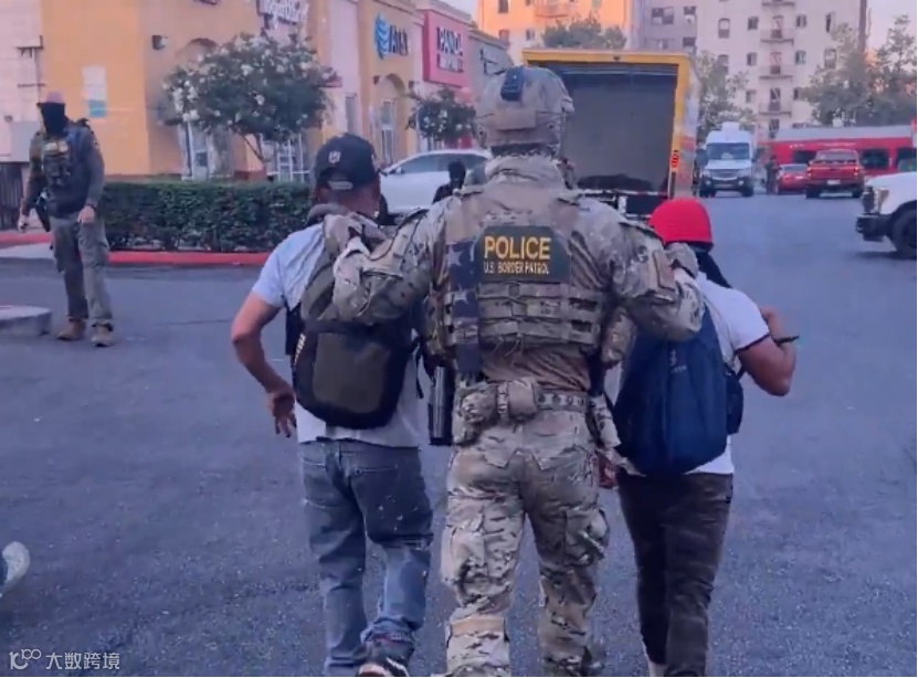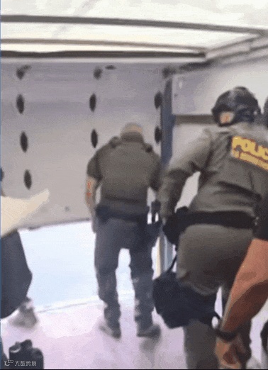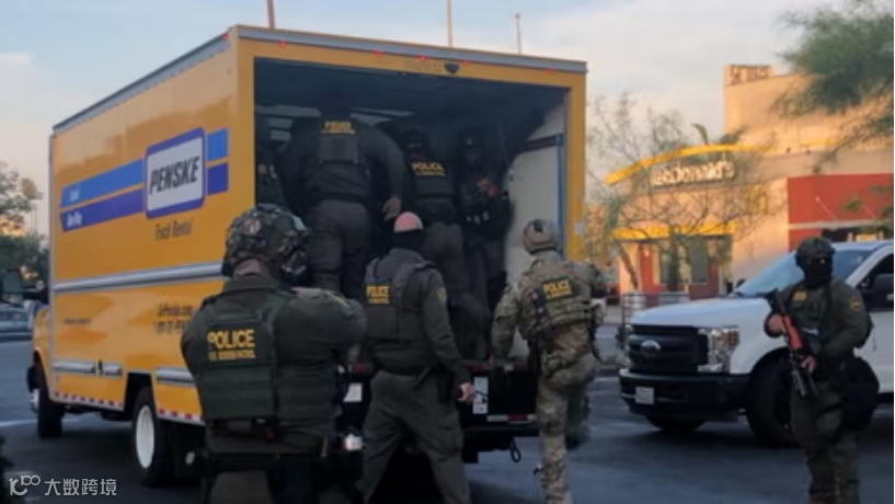 “一辆Penske卡车驶入停车场,特工突然从后车厢跳出实施抓捕。随后,一辆没有标志的白色货车也驶入现场,车上载有更多边境执法人员。”