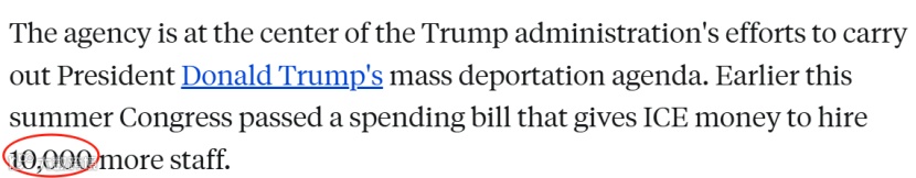 ICE是特朗普政府大规模驱逐计划的核心执行机构。今年夏季,国会通过一项拨款法案,为ICE新增10,000万名员工提供资金支持。