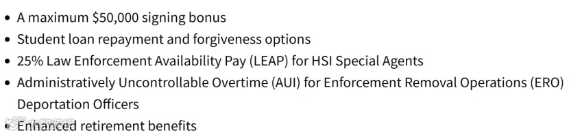 与此同时,ICE正借助国会新一轮拨款大力扩充执法队伍,不仅取消年龄限制,还开出高达5万美元的签约奖金,以加速推进特朗普政府的移民驱逐计划。