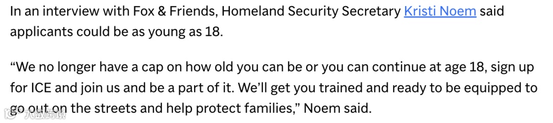 此前,ICE申请人的年龄限制为21岁至37岁或40岁,具体视职位而定。