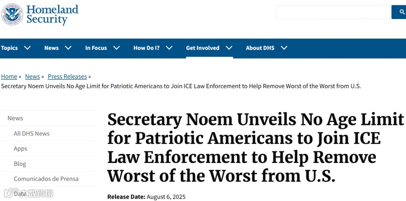 美国国土安全部部长克里斯蒂·诺姆(Kristi Noem)8月6日宣布,将取消负责移民执法机构新员工的年龄限制,以配合国会注入大量资金后扩大招聘的目标。
