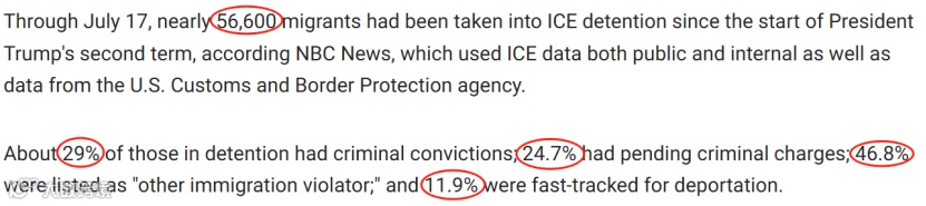 在被拘留者中,大约29%曾有刑事定罪,24.7%面临未决刑事指控,46.8%被归类为“其他移民违规者”,另有11.9%的人被快速驱逐出境。