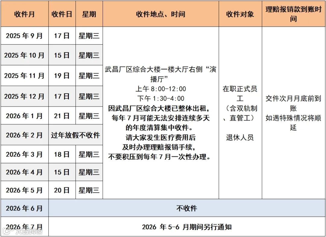 每年7月无法安排连续多天年度清算集中收件,请大家在发生医疗费用后及时办理理赔报销手续,不要积压到每年7月一次性办理。