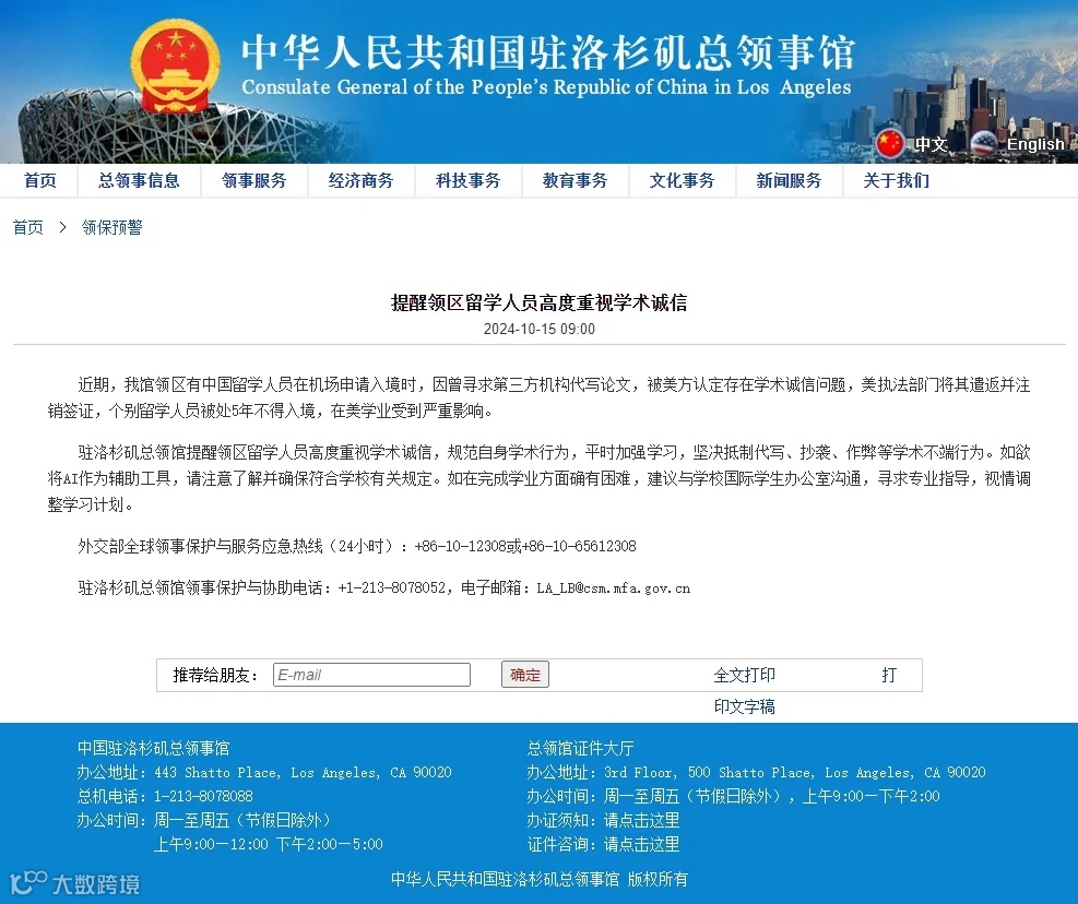 驻洛杉矶总领馆提醒领区留学人员高度重视学术诚信,规范自身学术行为,平时加强学习,坚决抵制代写、抄袭、作弊等学术不端行为。