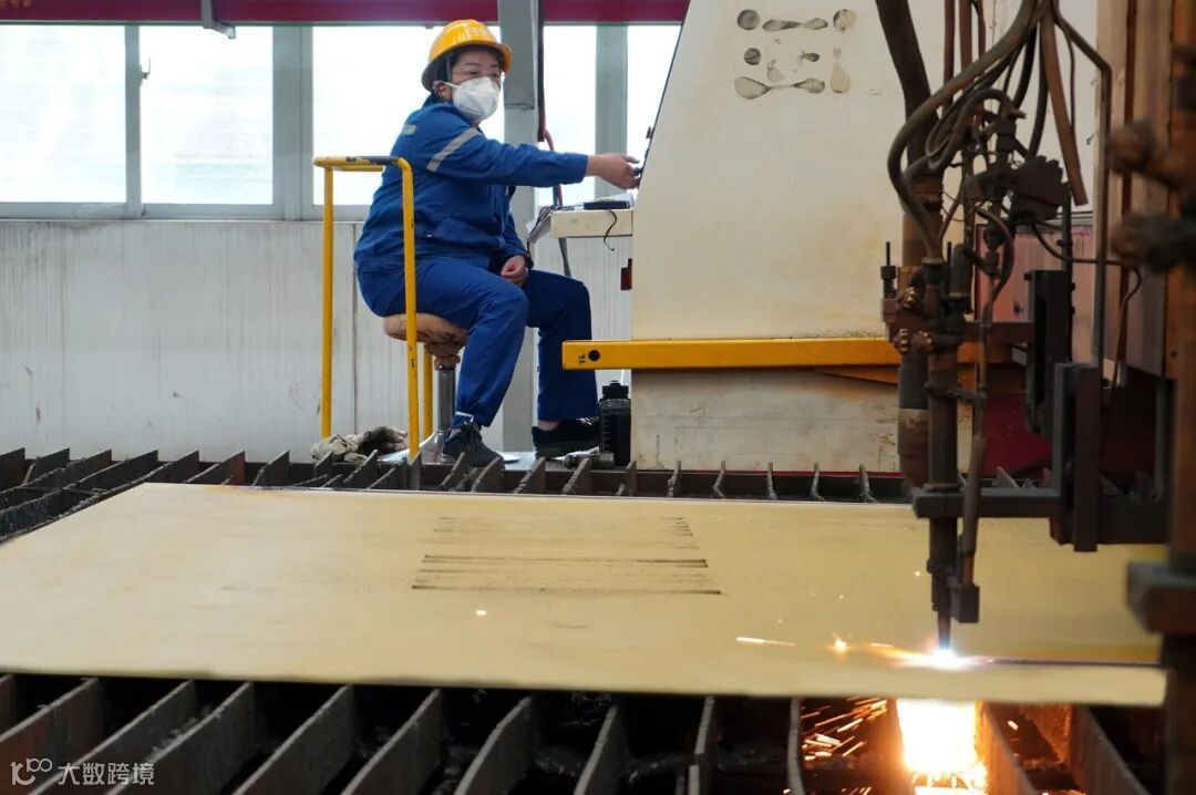 在蓝光映照的下料车间,一名气割工紧盯着屏幕上的参数,手指在控制面板上精准操作,切割弧光映在他专注的脸上。下料车间聚焦各个零件质量提升,严格执行工艺标准,产品下料加工合格率稳居98%以上。同时进一步深化精益管理工作,优化下料流程,并持续推进各类加工创新,应用数控编程,强化设备维保,落实车间“日检+周护”机制,保障设备运转率100%。