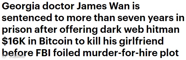 乔治亚州医生万*(* Wan,音译)被判7年多监禁,此前他向一名暗网杀手提供了1.6万美元的比特币,让他杀死自己的女朋友,但这场雇凶谋杀阴谋被FBI挫败。