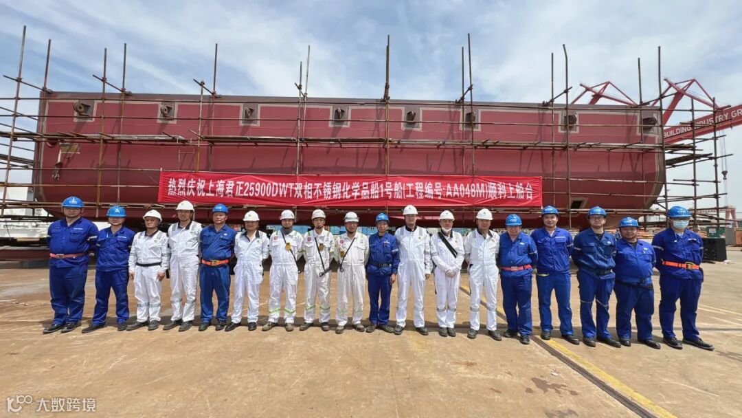 5月13日,武昌造船为上海君正船务有限公司建造的25900DWT双相不锈钢化学品船1号船顺利上船台,船东现场代表,美国船级社现场代表,武昌造船现场代表参加仪式。