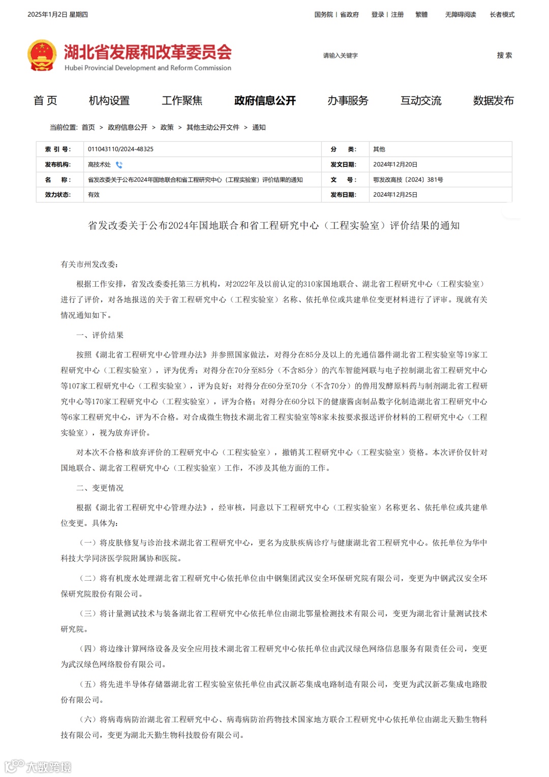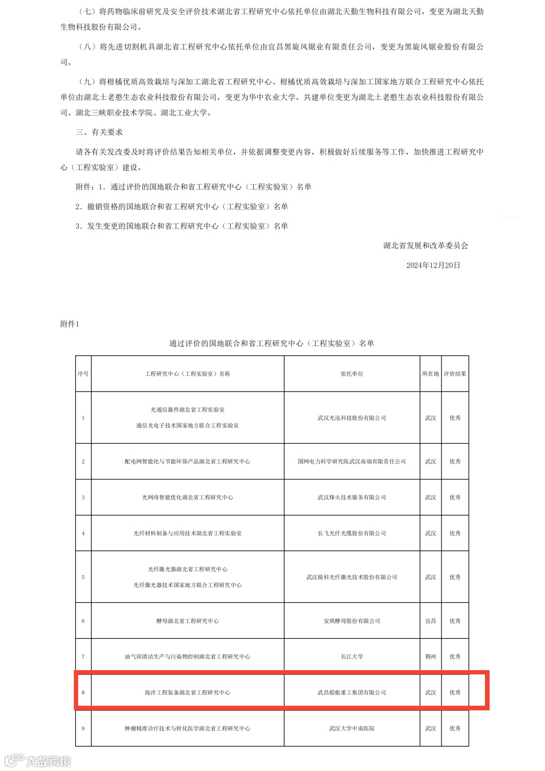 海洋工程装备湖北省工程研究中心是以公司为依托单位,联合华中科技大学共建的省级工程研究中心,旨在面向国家海洋工程装备领域重大技术需求,产学研用一体化协同创新,服务和支撑科技成果转化和产业化发展,2012年获批成立,每两年复审一次。公司在本次复审评价的302家省级中心中再获高分,成为19家“优秀”中心之一,连续两个评价周期获评“优秀”。