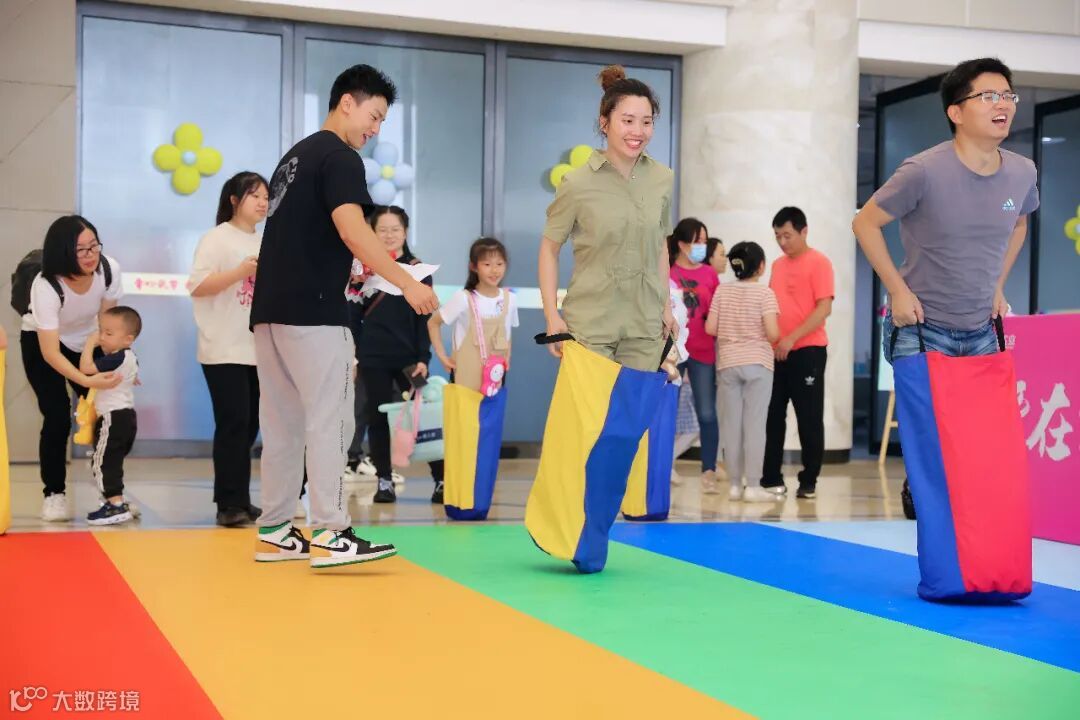 “袋鼠接力”环节,大大小小的“袋鼠”们双手紧紧抓住袋子,眼睛盯着前方,跳跃着奔向终点。