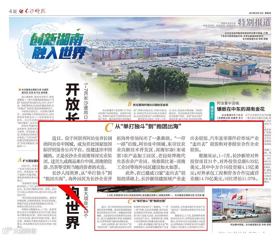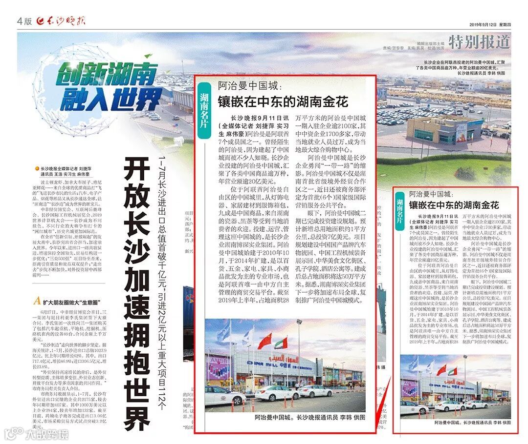 长沙晚报在“创新湖南,融入世界——开放长沙加速拥抱世界”专栏中,对博深集团海外园区项目进行了重点报道。看到这里,“博深君”激动了!博深集团作为土生土长的湘企,始终致力于落实“湖南开放崛起”战略,不断加快“走出去”的步伐,在全球多个国家落子布局。被誉为湘企“投、建、营”新名片的阿治曼中国城项目,以及省、市两级重点外贸综合服务平台的博深供应链正源源不断的引领着湖南企业、湖南商品走出国门,走向世界。