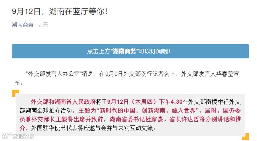 在新中国成立70周年之际,以“新时代的中国:创新湖南,融入世界”为主题的外交部湖南全球推介活动于9月12日在外交部南楼举行。