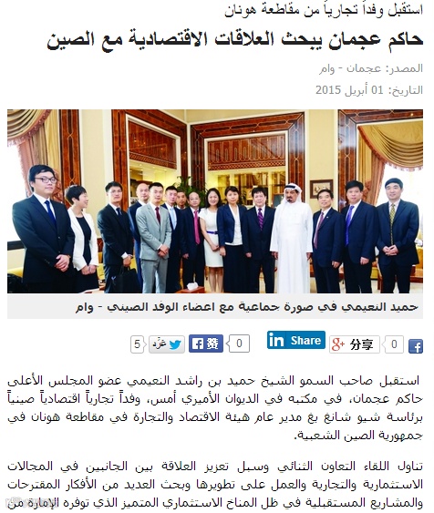 2015年3月31日,湖南省商务厅厅长徐湘平率领的湖南省代表团一行拜会了阿联酋最高委员会成员、阿治曼酋长国酋长谢赫.胡迈德.本.拉希德.纳伊米,就加强湖南省与阿治曼酋长国经贸合作交流及推进具体项目落实展开了深入交流。