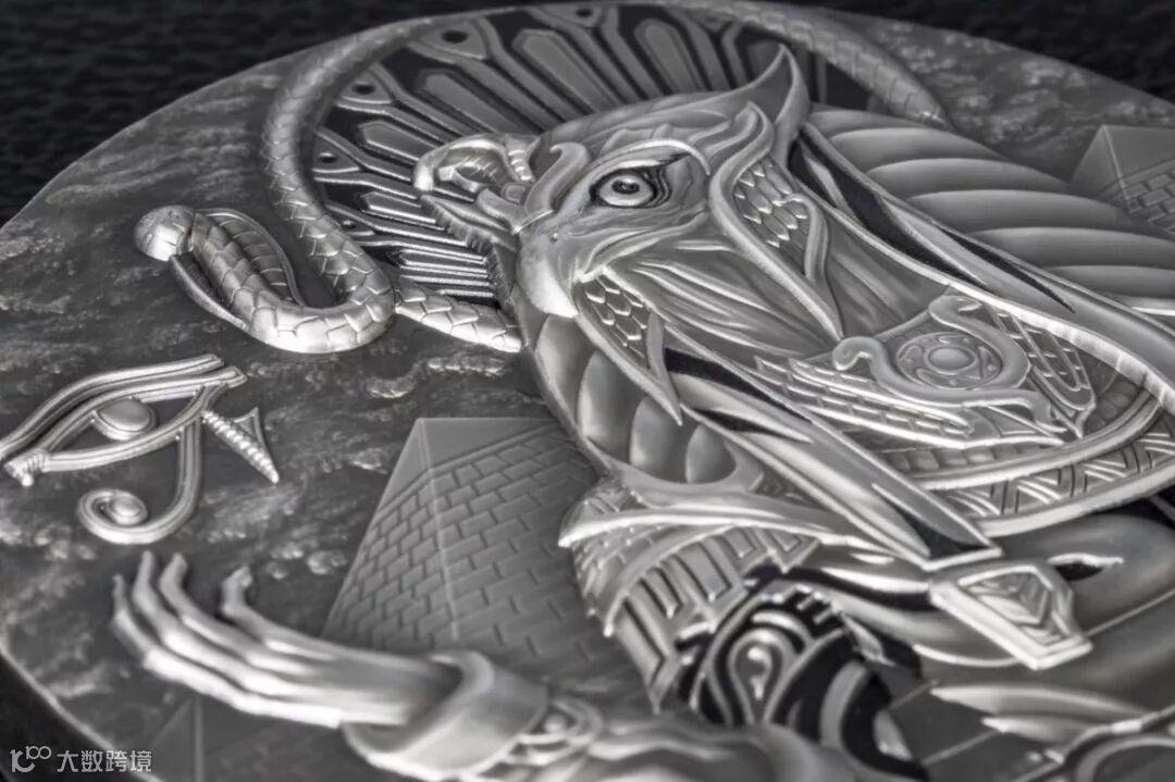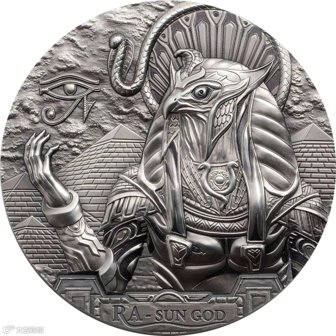 Ra是古埃及的太陽神。祂是古埃及宗教中最重要的神,眾神之王,是創造和主宰天空、大地和冥界三地的主要神祇。祂的形象以鷹頭人身,頭頂太陽圓盤和眼鏡蛇,一手拿著權杖,一手拿著生命之鑰。而這枚銀幣描繪了太陽神.拉的手上方出現一隻眼睛-荷魯斯之眼(真知之眼),有分辨善惡、捍衛健康與幸福,也具有復活死者的力量。