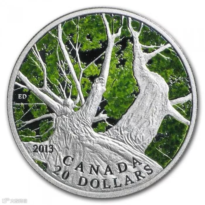 作為加拿大楓樹冠系列中的第一枚銀幣,銀幣描繪了春天的糖楓樹,靠在高聳的和寬闊的糖楓樹樹幹上,以綠色的拱頂呈現出大自然的美妙。