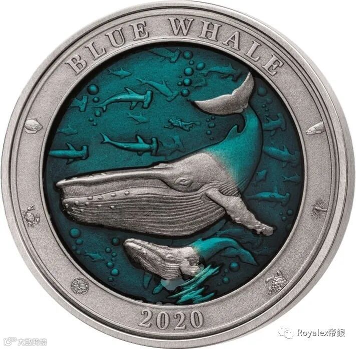 這枚美麗的3盎司銀幣是“海底世界系列”系列的最新作品,主題是海洋中的巨人——藍鯨。這枚硬幣的設計一如過往有漂亮的海藍色琺瑯,創造出獨特的3D效果,具有仿古的設計,每枚硬幣皆有精美包裝盒及真品證明書。全球限量發行999枚。