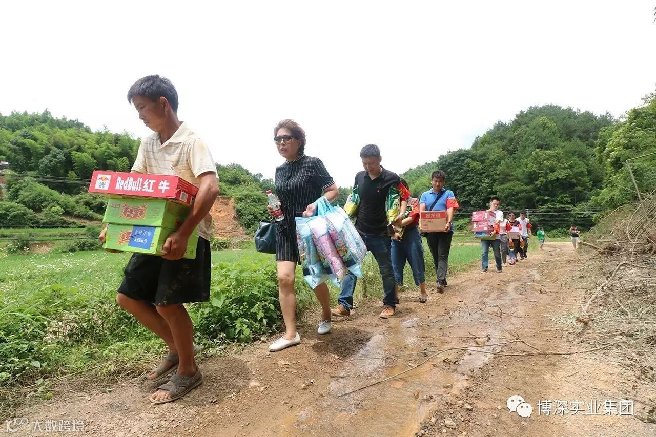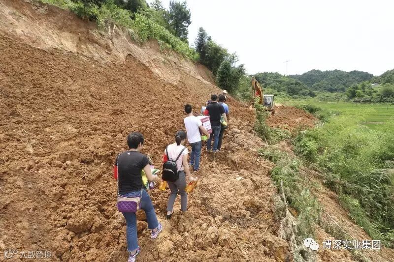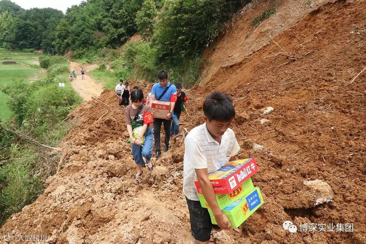 为了第一时间将救灾物资送到灾民手中,集团全体党员扛着物资,在陡峭泥泞的山路上徒步前行,挨家挨户走访慰问。