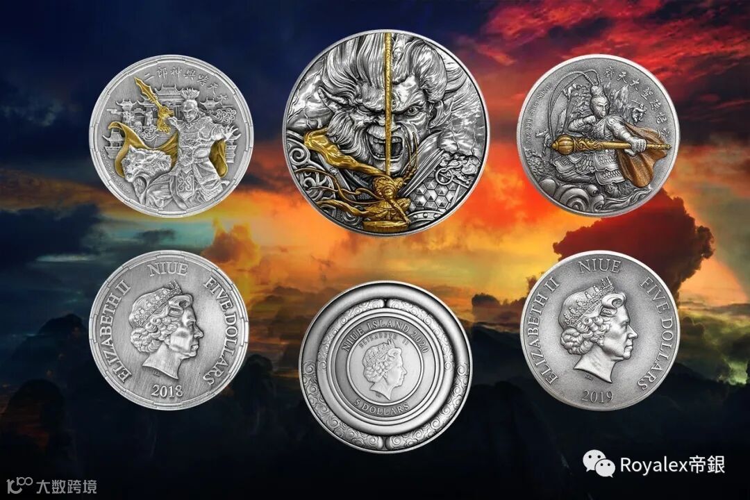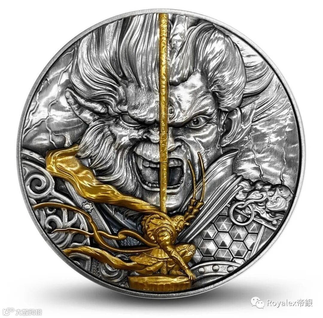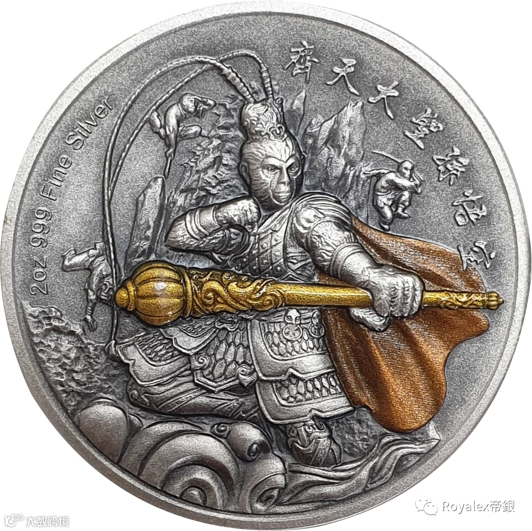 這枚神奇的2盎司銀幣是新“中國神話”系列的第一期,主題是中國的神和神話。這次的主題是「孫悟空」。這枚硬幣呈現出美妙而細緻的超高浮雕,有漂亮的局部鍍金,硬幣表面是仿古特色的處理,每枚硬幣皆附有包裝盒和真品證明書。全球限量發行555件。