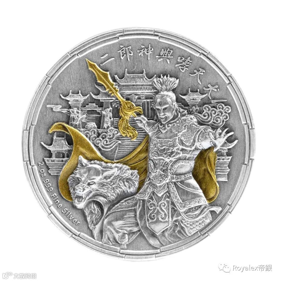 該系列的第一枚銀幣的主角是二郎神,他是最強大的天兵,也是小說《西遊記》中的一個受歡迎的角色。在中國神話中,他以三只眼睛和嘯天犬而聞名。二郎神標誌性的三叉雙刃騎槍和他的武士披風都是鍍金,站在宏偉的天庭門前,準備戰鬥。這枚銀幣有著高浮雕的工藝,給人一種天兵天將的敬畏之感。每枚銀幣皆附有包裝盒及真品證明書。