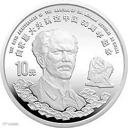 下面要介紹的這套紀念幣用聯合發行的方式來體現“中西合璧”。這就是1998年中國與加拿大兩國政府聯合發行的白求恩大夫到達中國60周年紀念銀幣。這套銀幣共有兩枚,中加兩國各發行一枚。中國發行的銀幣表現的是白求恩來到中國後的人物形象與工作場景。