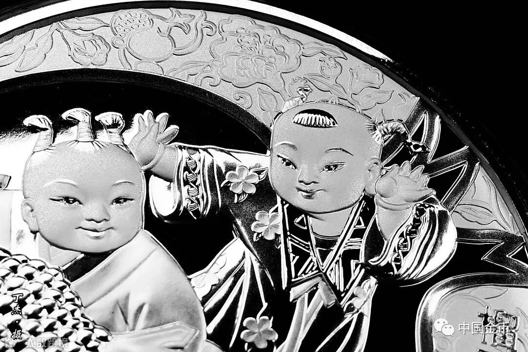 2019吉祥文化榴開百子銀幣背面設計同樣以寫實風格的童子為主,只不過相較2018年多了一童子,豐富了幣面元素也增強了故事感。