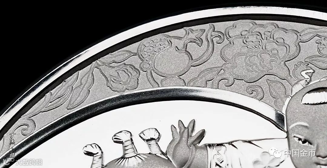 這枚銀幣最大的設計亮點就是以石榴輪廓剪影為背景來突出主題,為前景的故事增添形式感。石榴輪廓內的鏡面做成下沉式凹型弧面,既體現石榴的果形,又便於人物的高浮雕表現,使之形象更加立體生動。