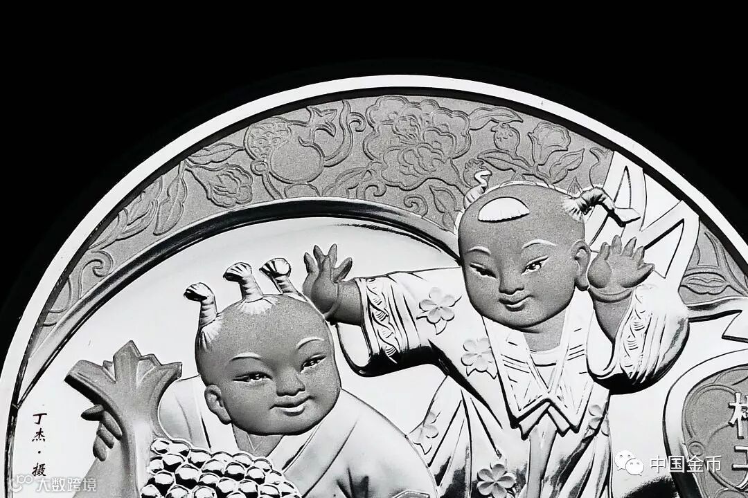 該銀幣細節刻畫方面,注重主體人物形象的刻畫,娃娃小胳膊小腿肉肉的萌萌之態,讓畫面更有感染力。娃娃頭上紮著小辮,小辮子在奔跑中舞動,渲染出孩子們互相嬉戲的活潑氛圍。