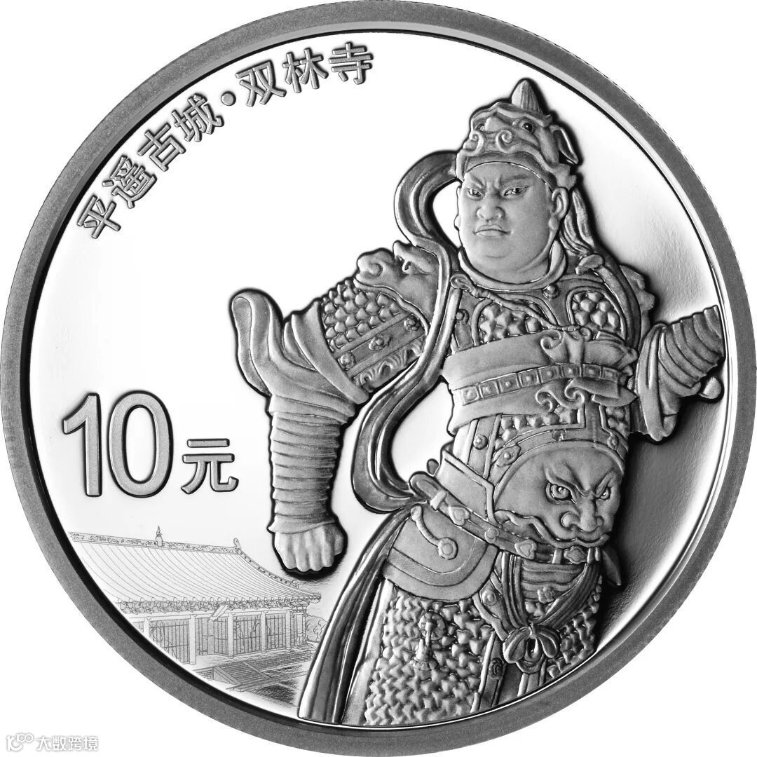世界遺產(平遙古城)金銀紀念幣30克銀幣的背面圖案為雙林寺韋馱塑像造型。