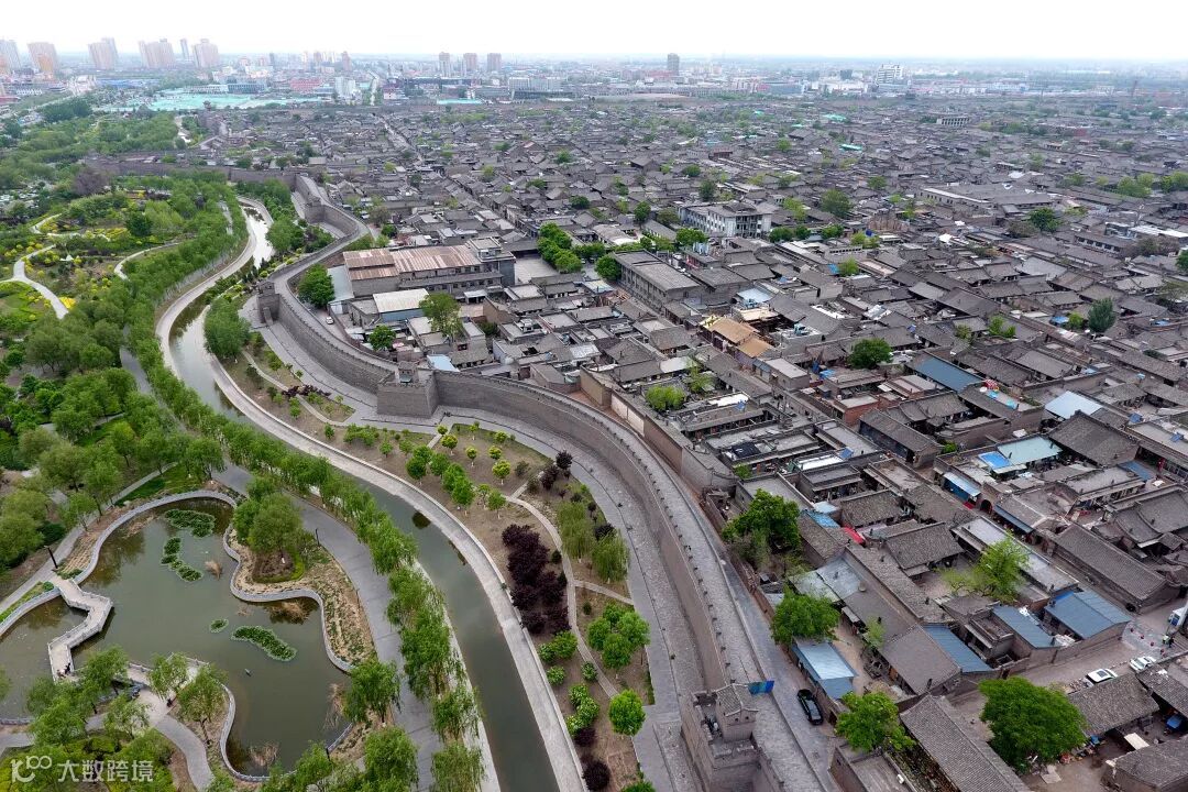 無人機拍攝的平遙古城城牆與護城河 新華社