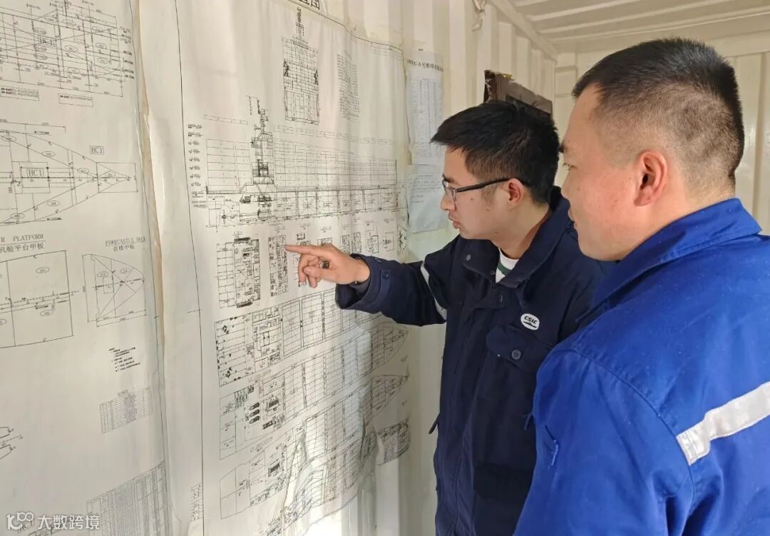 ▲河北溢油回收船总建造师喻浩和安全员刘明峰正在巡查舵叶安装前的准备工作及设备保护情况