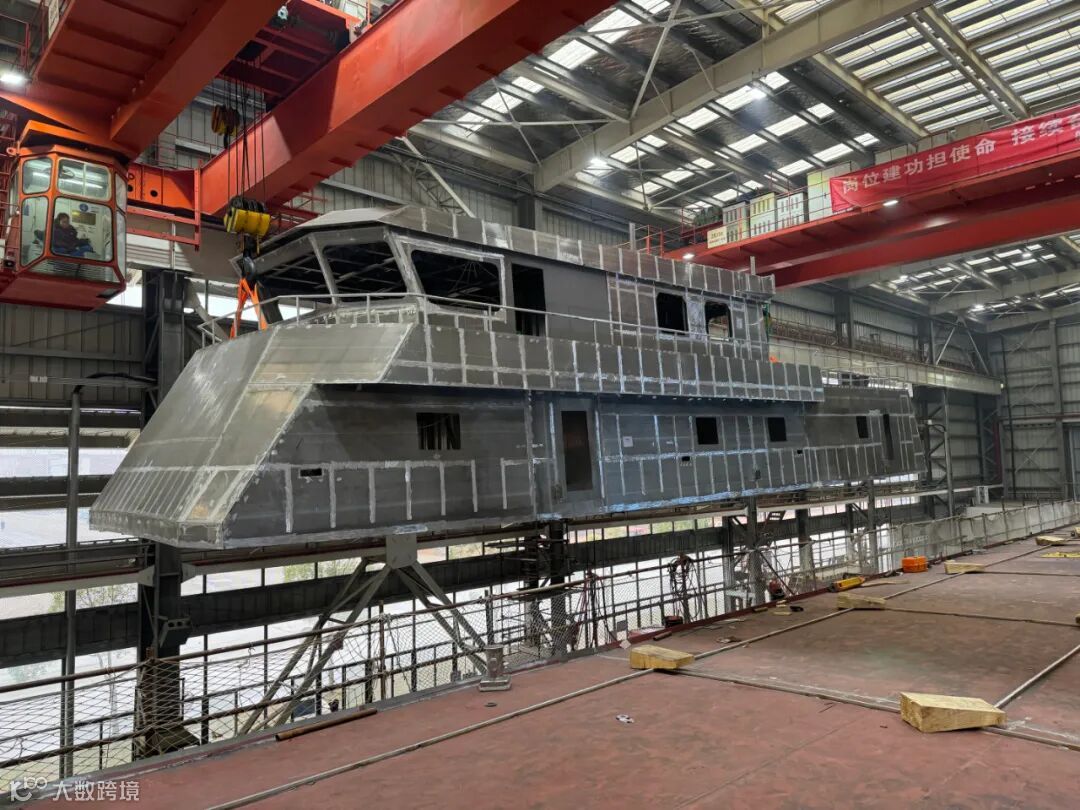 近日新建300吨级渔政执法船上建总段吊装上船台,此次吊装高度数据为车间吊装极限,项目组紧密协调设计所和各专业负责人员确定保障吊装方案,严格检查行车设备运行可靠性,最终成功吊装。