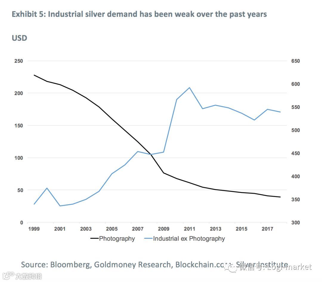 因此,自2013年以來,工業需求略有下降趨勢。我們認為過去幾年工業需求低迷是白銀價格表現疲弱的原因之一,並且部分解釋了白銀落後黃金的原因
