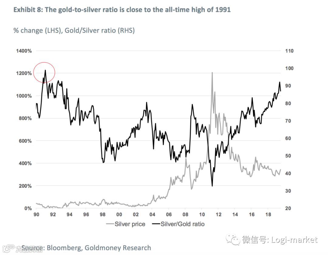 因此,白銀目前的交易價格為金價88,接近1991年的歷史高位。當時白銀交易價格為3.67美元/盎司。這也標誌著白銀價格的中期低位,然後在2011年達到峰值之前上漲了1300%