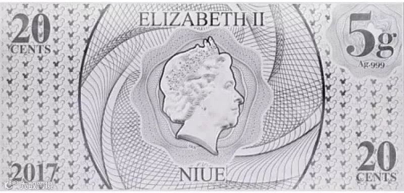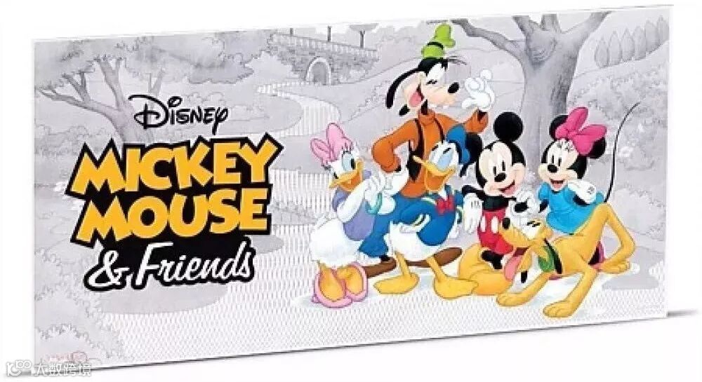 這枚令人愉悅的銀鈔,是紐西蘭鑄幣局為了慶祝迪士尼米奇和他的朋友們而推出的,其中裡面每個迪士尼人物都以彩色刻畫,且每張銀鈔的反面皆印有一組限量內的編號,而銀鈔的背面印有伊麗莎白二世女王陛下的肖像,面值,年份和重量的字樣。 面值:NZD $0.20