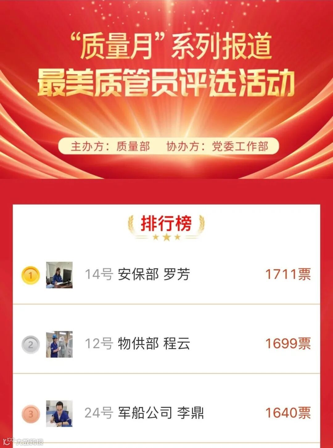 为增强广大质管员的岗位荣誉感,树立典型质量管理人员形象,深化榜样的力量,公司开展了“最美”质管员评选活动,参评质管员30名,经过一周的投票评选,安保部罗芳、物供部程云、军船公司李鼎荣获“最美”质管员前三,活动参与投票总数达18355票,营造了浓厚的学先进、赶先进、做先进的质量氛围。