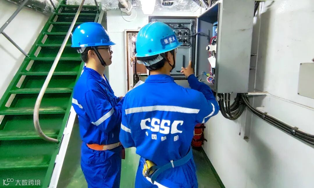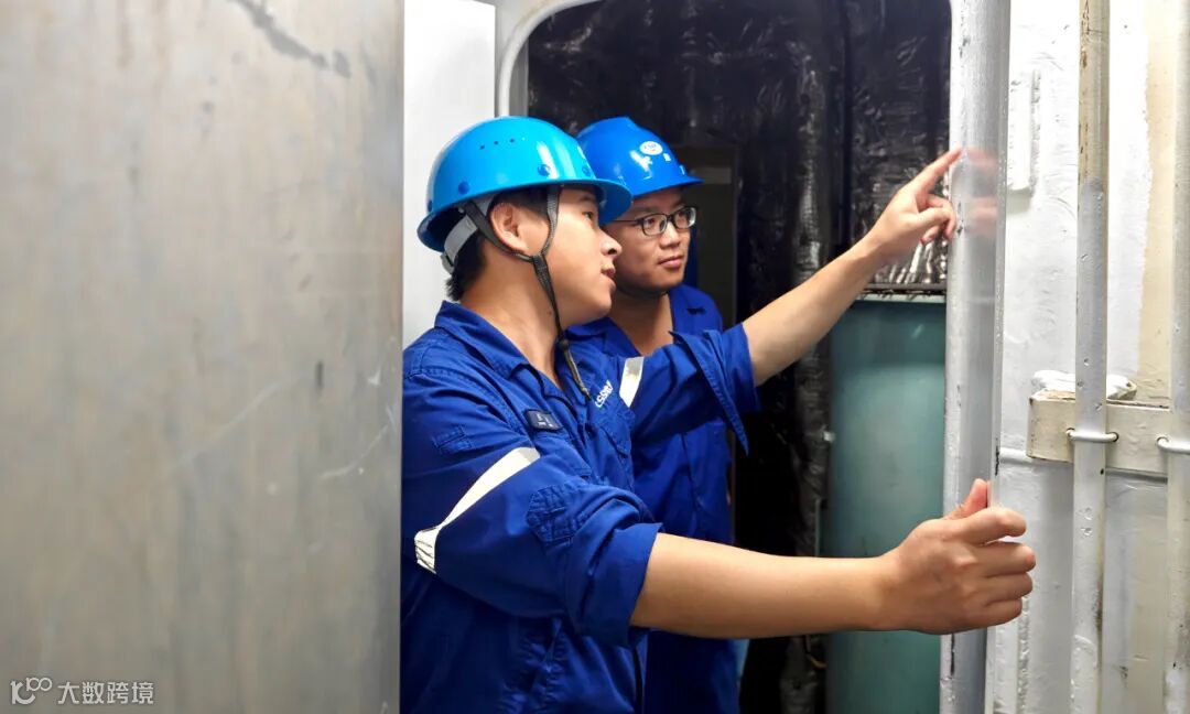 ▲设计院轮机主管张健,船体主管何志祥,检查风道阻气门安装是否安全满足技术及安全要求