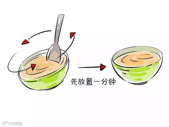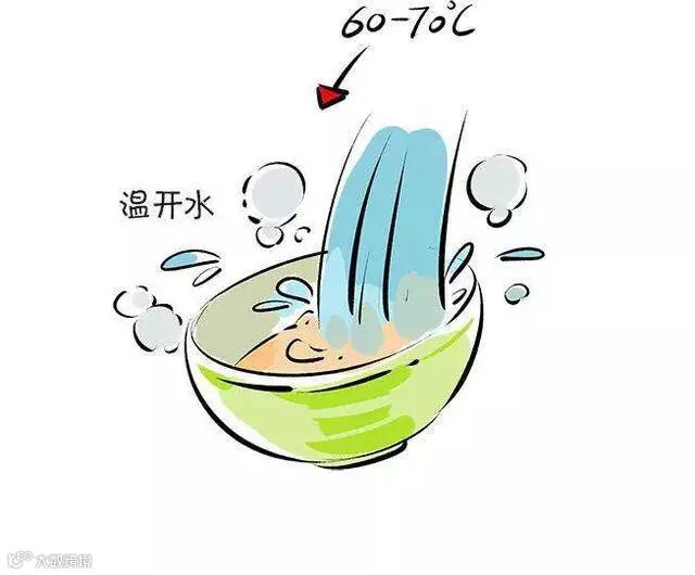 舀好放到小碗后,按照说明上的比例,缓缓倒入相应量的温开水,水温60-70度最佳。一般婴儿米粉都是熟的,温水就能冲泡成米粉糊糊。千万别水一烧开就去冲泡,太烫了会破坏米粉里头的营养物质,营养大打折扣。