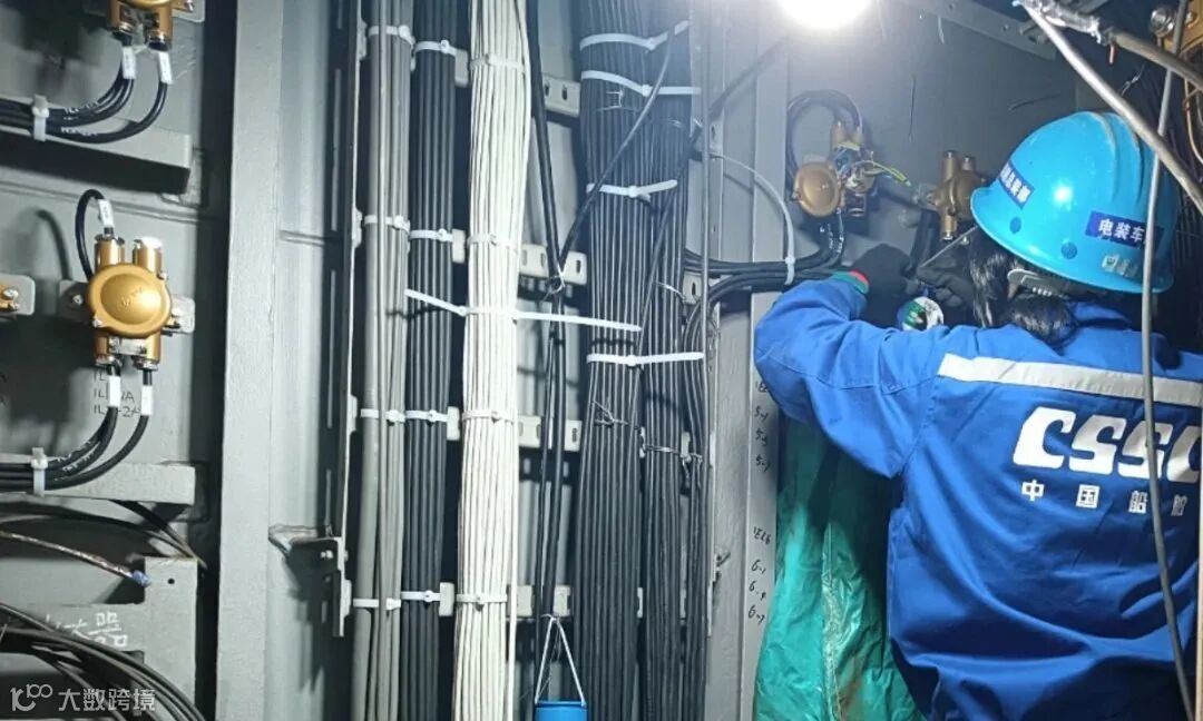 ▲总装部电装车间船舶电工周莎莎正在进行小设备接线。