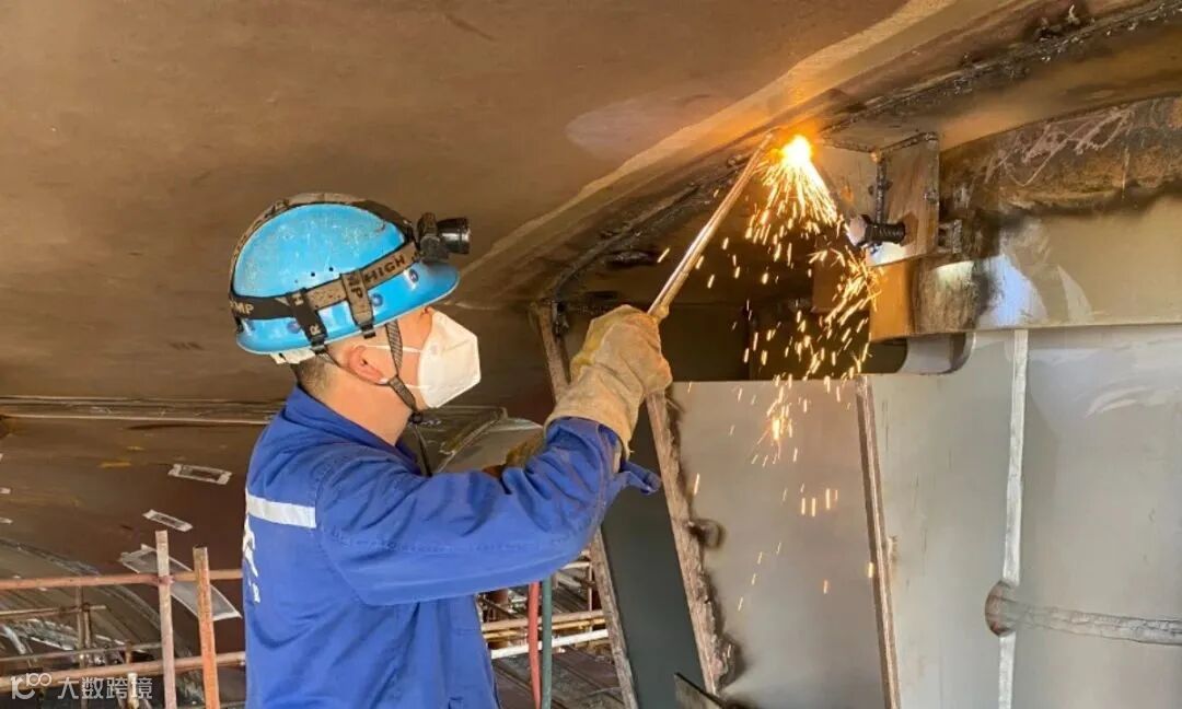 ▲总装部船台车间船体装配工喻小帆在进行装配工作。