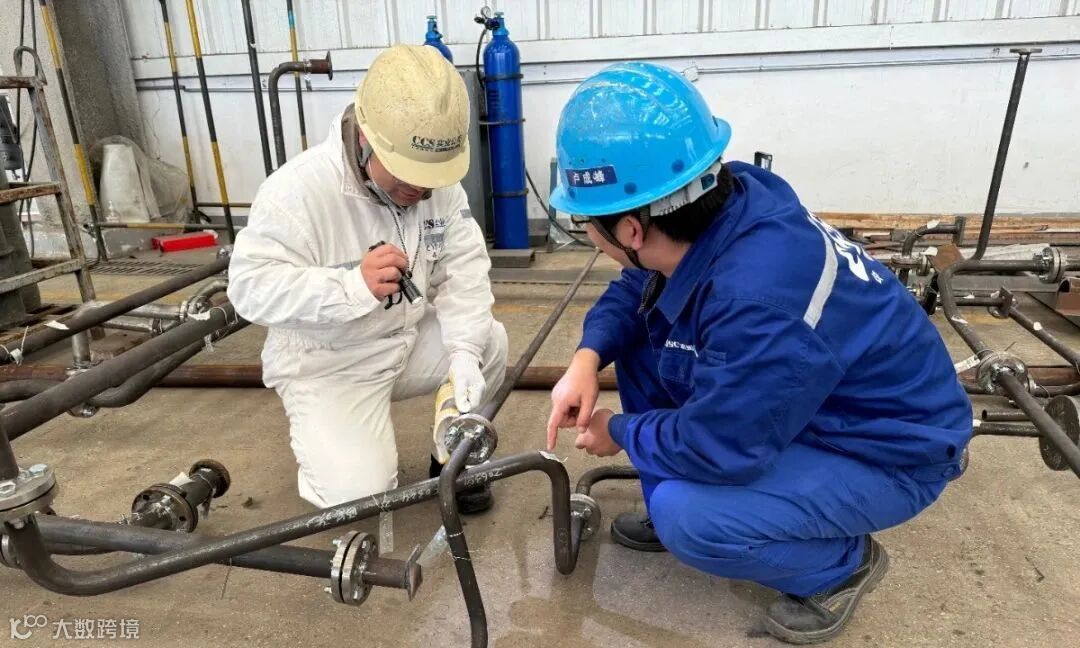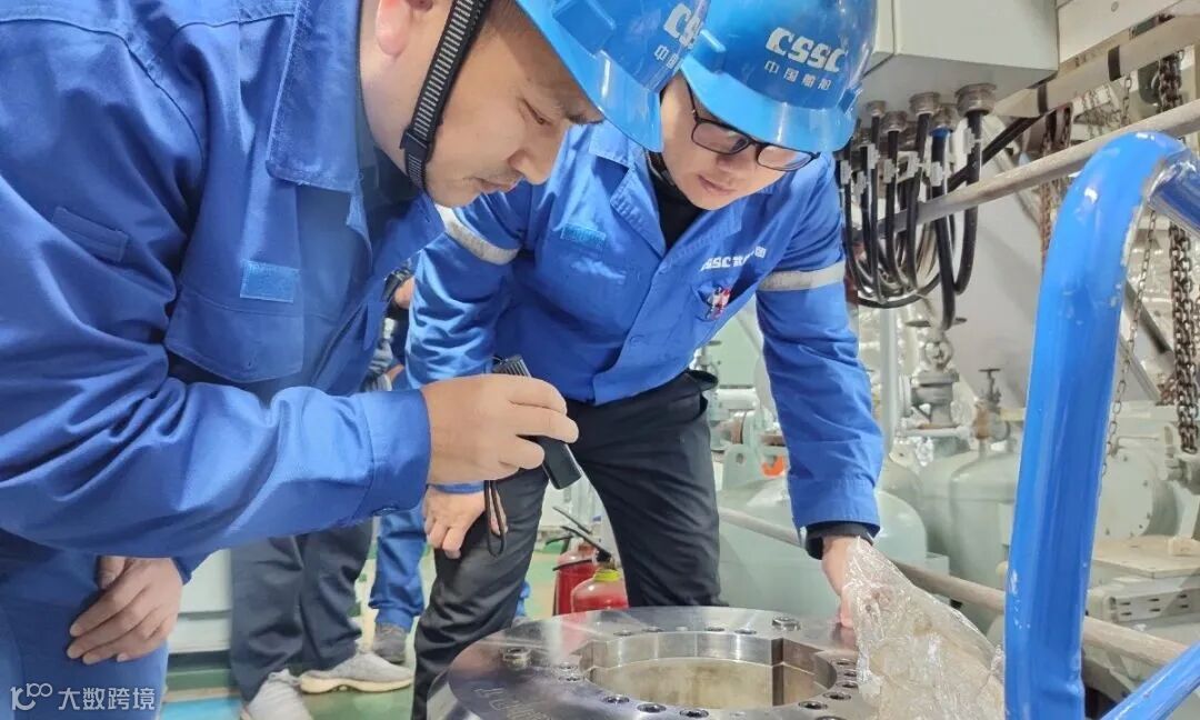 ▲船艇公司管系质量员卢成峰正在与船检进行管路报验工作。