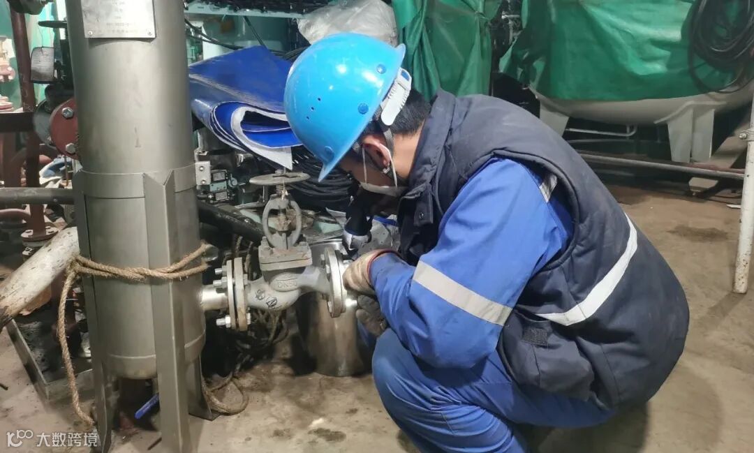 ▲总装部机装车间宏翔一组船舶钳工晁志磊在进行燃油日用管路串洗。