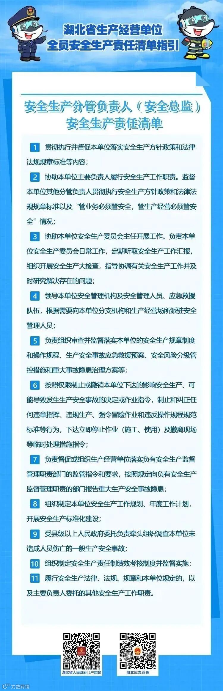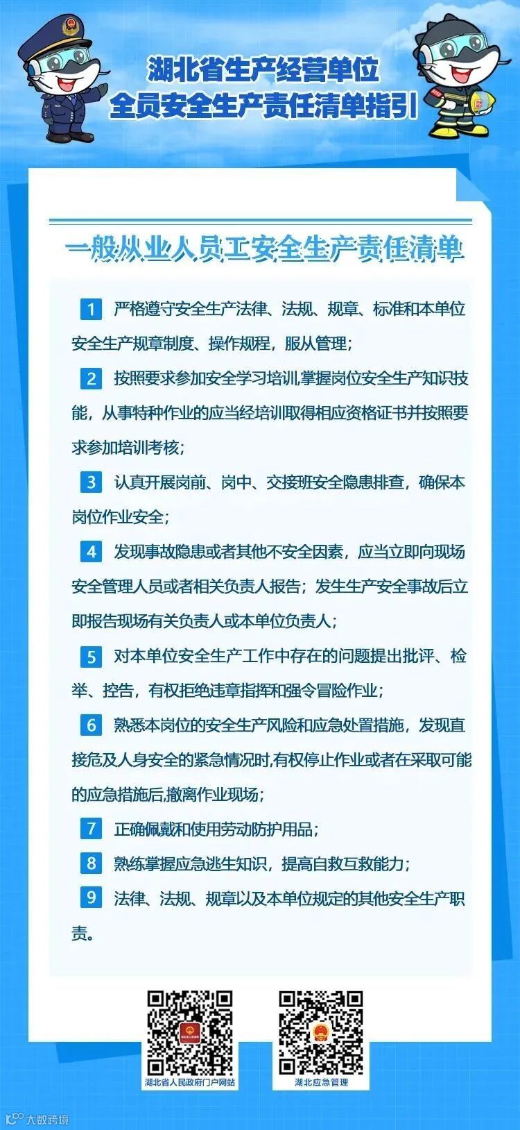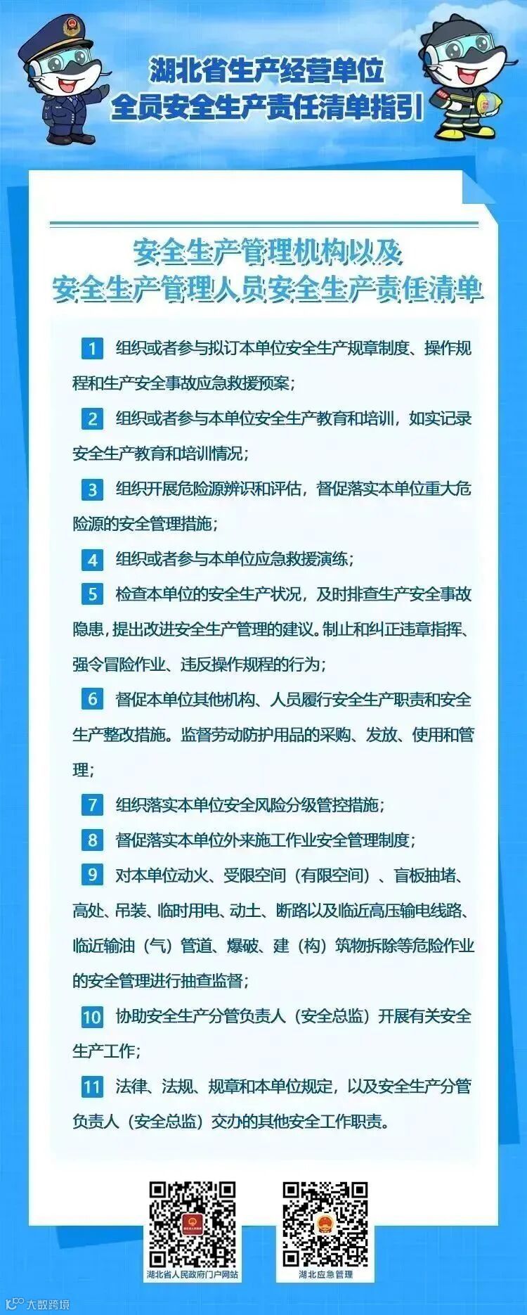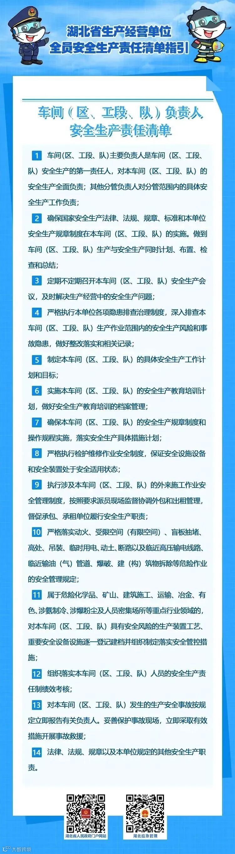 为了帮助生产经营单位建立健全全员安全生产责任制,推动包括主要负责人在内的各类从业人员充分认识、全面履行自身安全生产职责,2022年10月21日,湖北省安全生产委员会办公室印发了《湖北省生产经营单位主要负责人安全生产法定职责清单指引》和《湖北省生产经营单位全员安全生产责任清单指引》的通知(鄂安办〔2022〕51号,以下简称“两个清单”)。
