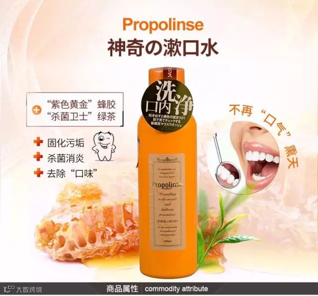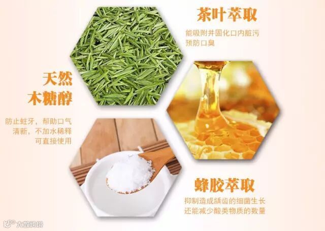 温和清爽的茶叶及蜂胶提取物成分配合天然甜味剂木糖醇配方,入口是蜂胶特有的那种酸涩味配合绿茶香,能有效将口腔中蛋白质污垢固化,清新口气,防止口臭,美白牙齿,令口腔清爽无负担,简单30秒,轻轻松松告别食物残余,细菌,口气,牙石,烟渍等。