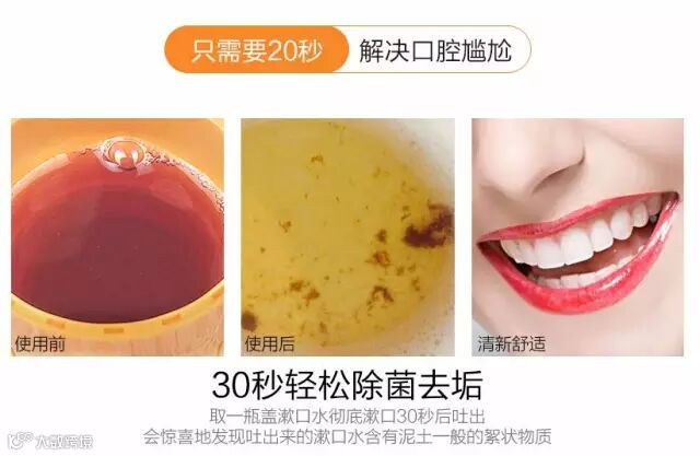 它的主要功效是把牙齿,牙缝,舌苔等口腔中的残留物等细菌和蛋白质相结合凝固后,随着漱口水排出口腔,并在牙齿表面形成保护膜让口腔细菌无法附着在牙齿表面。同时清除产生异味和口臭的成分,让口气清新。清洁牙刷到达不了的地方,可以保持健康的口腔卫生。