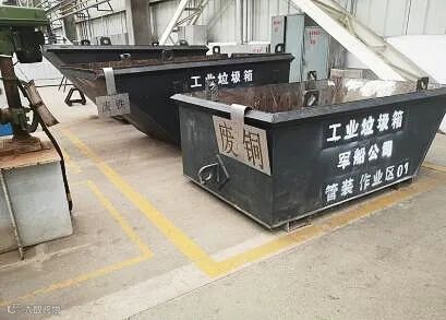 军船公司管装车间针对不同废料设置标识牌,进一步做好金属废料的分类存放;针对异型、大型废料,使用废料架承装;实施喷涂的车间对产生的油漆沾染物捆扎后放置在危险废物箱内,节省空间且减少挥发性有机物的产生。