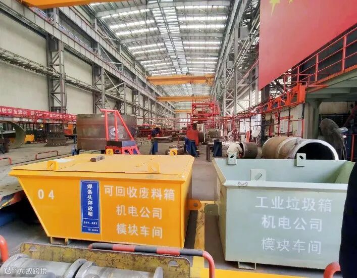 船舶总装部在生产现场设置垃圾分类告示牌,另配置了42个黄色铁箱分布在各产品及总组上,存放各类可回收再利用的型材及余料,装满后吊运至分拣区进行分拣和拼接、反复使用,有效提高材料利用率、节约成本。