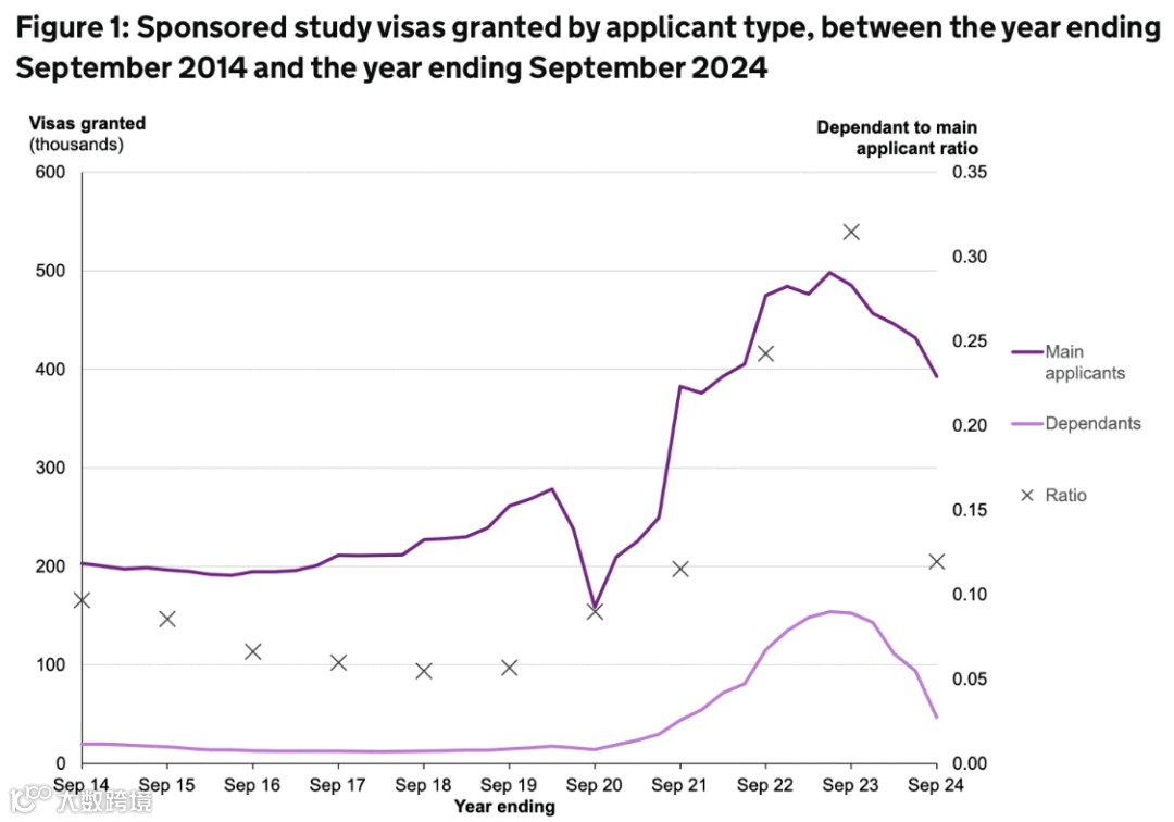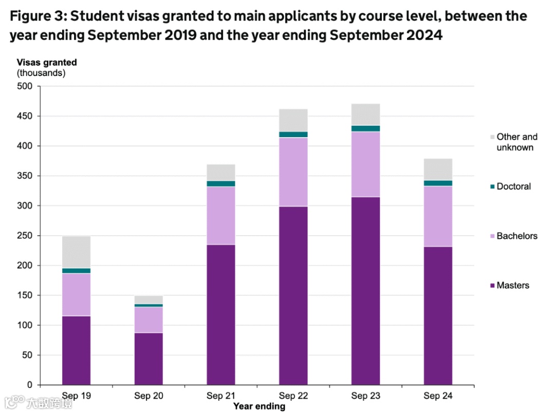 英国留学市场从峰值时接近50万人(精确数据为2022年7月至2023年6月间498,068个留学签证),下降到不足40万人(精确数据为2023年10月至2024年9月间392,969个留学签证),降幅21.1%。