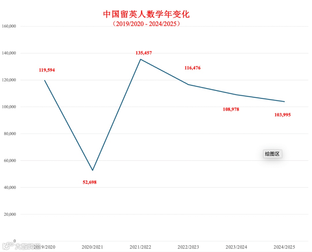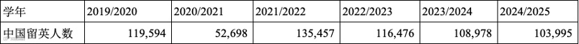 2024/2025学年,中国留英学生接近10.4万人(精确数据为2023年10月至2024年9月间103,995个留学签证),超过印度学生,占英国国际学生总量的26%。